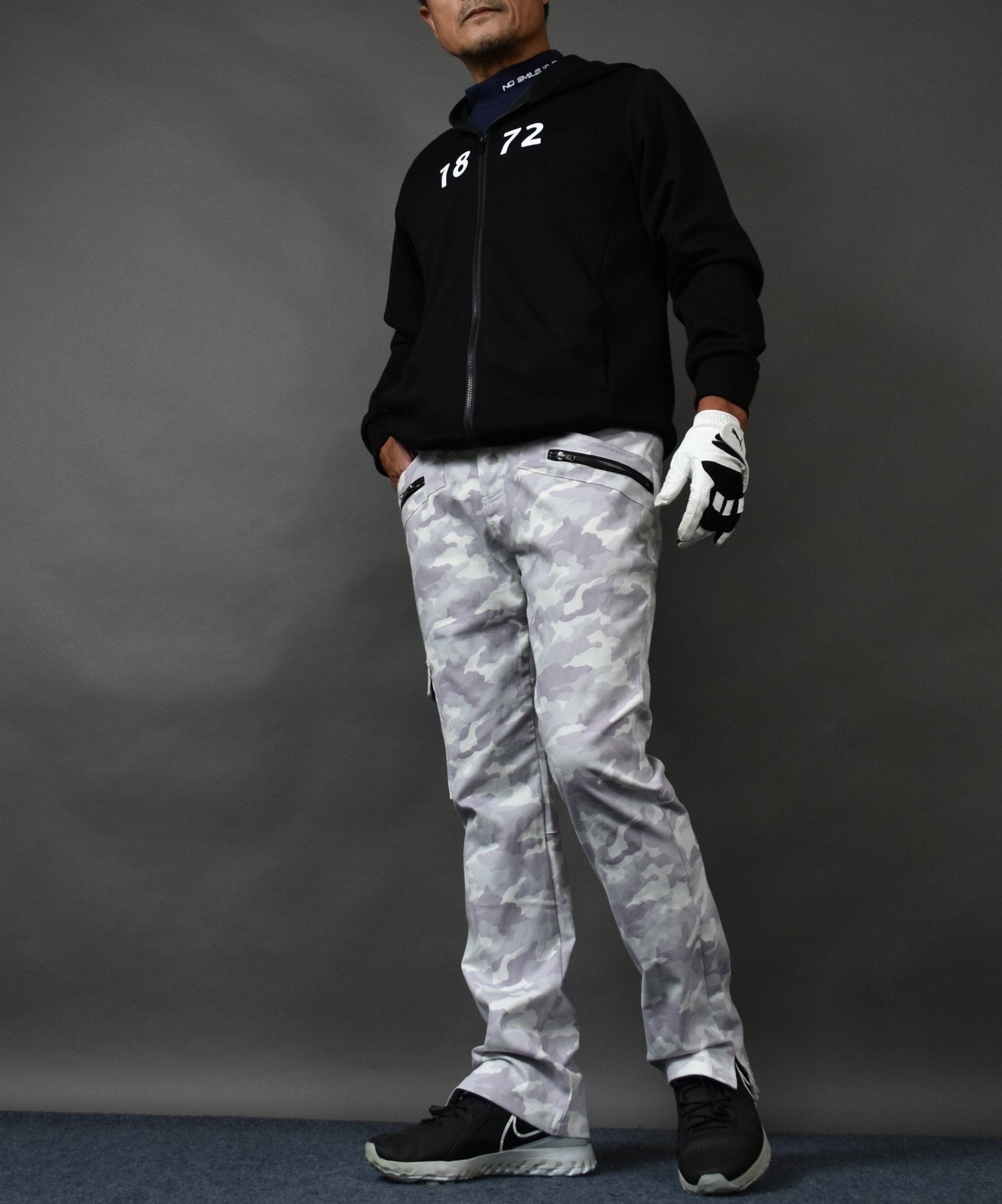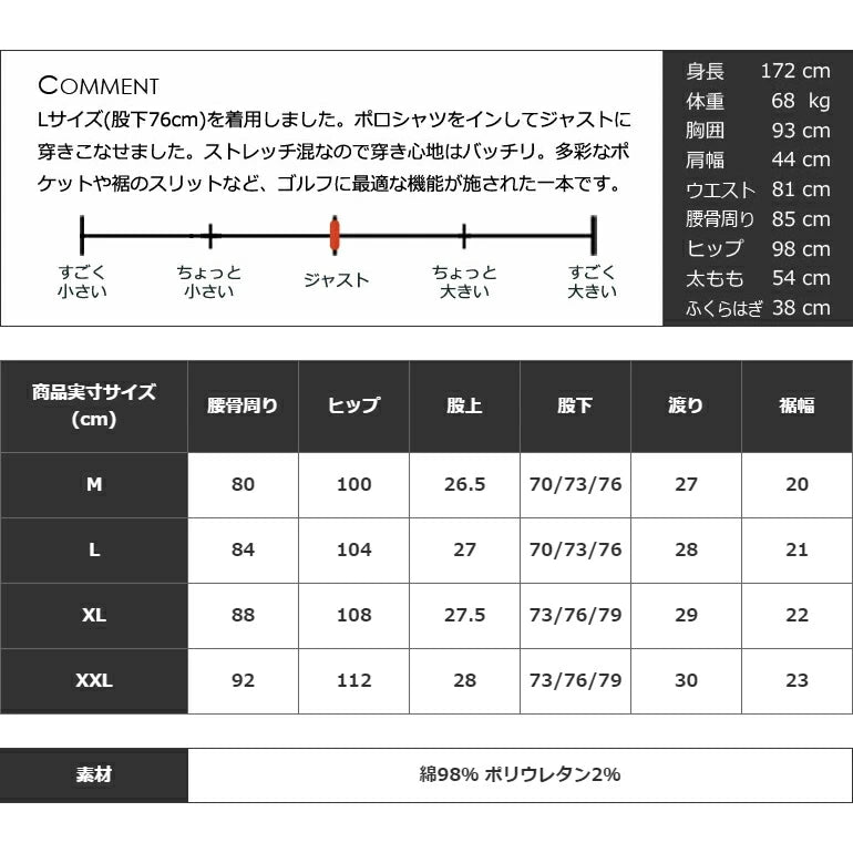 股下はMサイズとLサイズが70cm、73cm、76cmの3種類から、XLサイズとXXLサイズが73cm、76cm、79cmの3種類からお選びいただけるので、面倒なお直しの必要は無く届いたその日にすぐ穿けます。シルエットも動きやすさも言うことなし、ゴルフ場でお洒落にキメたい時はこのパンツで決まりですね!!