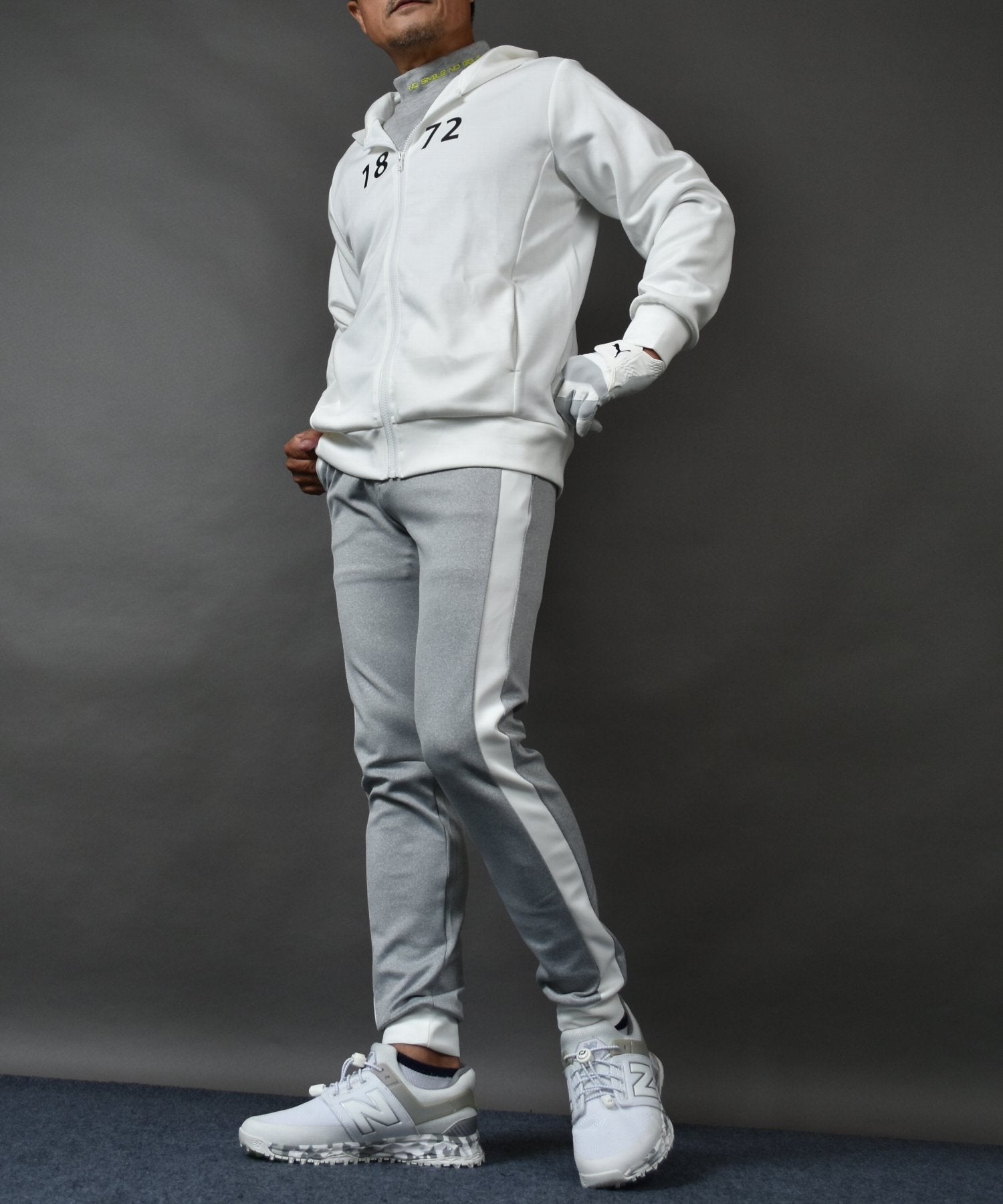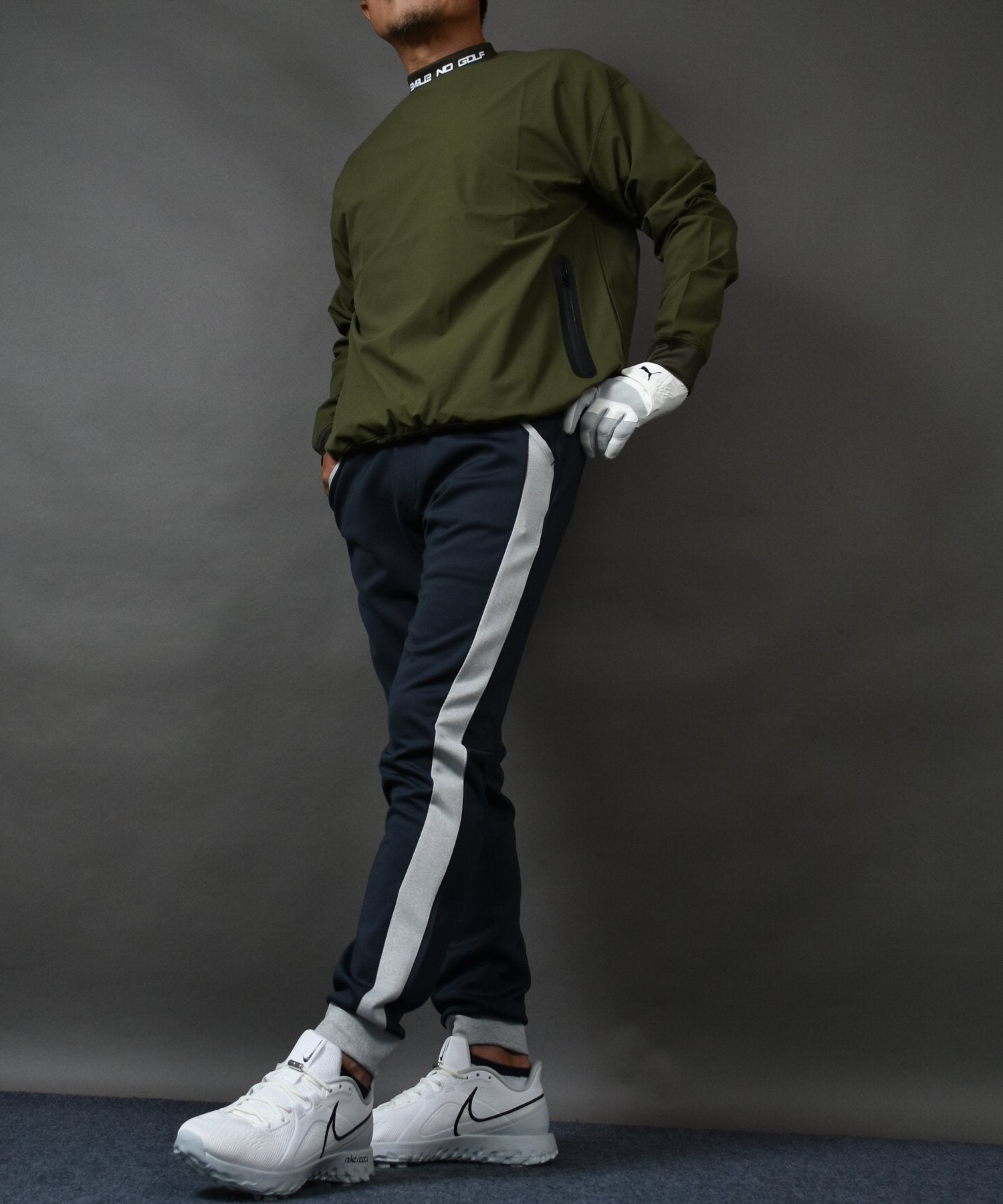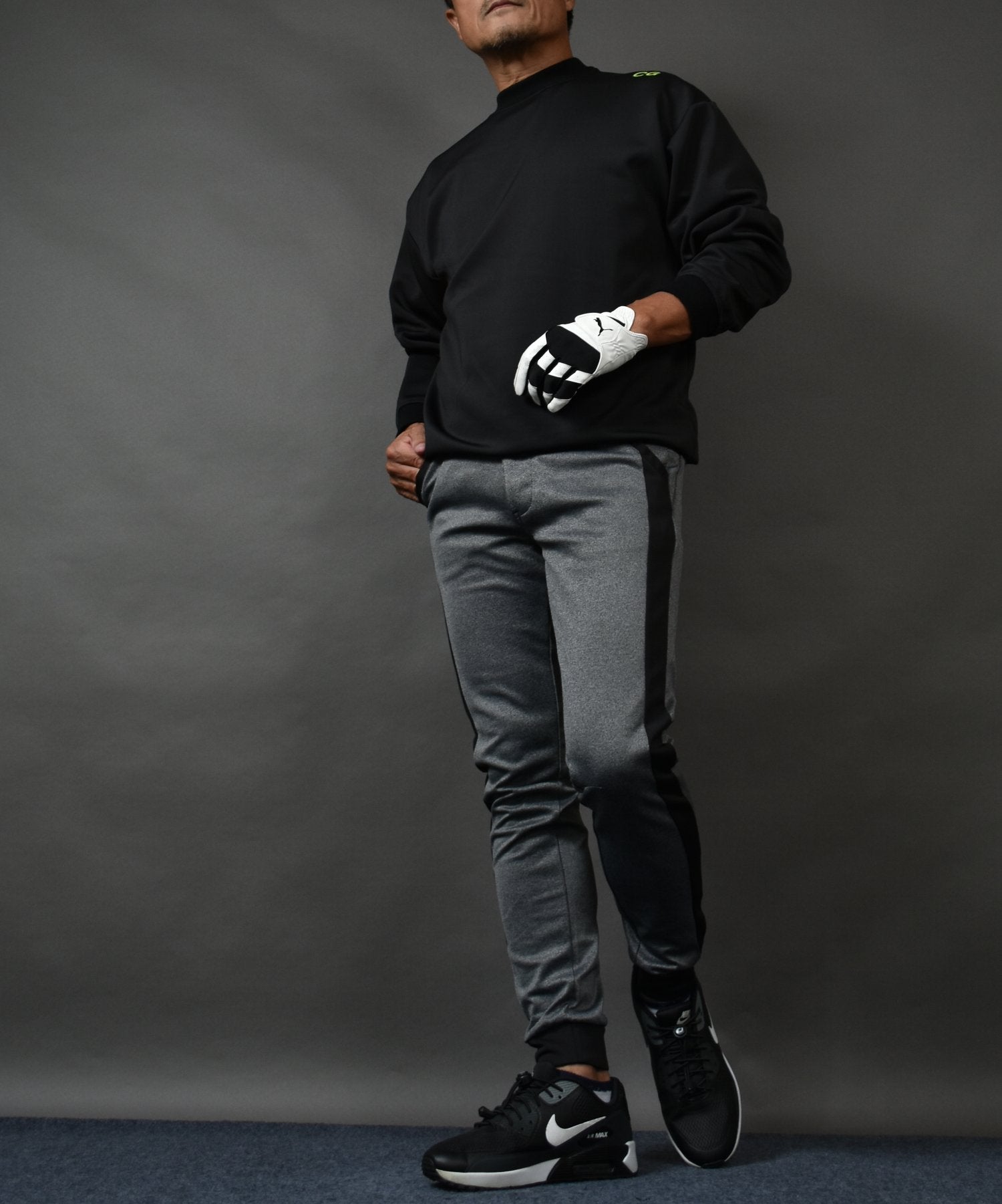 今とにかく人気のゴルフ用ジョガーパンツ!スタイリッシュに裾先に向けて細くなったテーパードシルエットで、裾ゴム仕様のアンクル丈のジョガーパンツです。スッキリと綺麗な見た目ながらリラックス感満点のパンツだから、どんなトップスとも相性抜群でお洒落なスタイリングなっちゃいます。つい着用頻度が上がってしまう程、ゴルフプレー時はもちろん、行き帰りやタウンユースでもとにかく使える1本です。サイドラインもカッコよく、Dカン付きでボールケースを付けるのにも便利です。