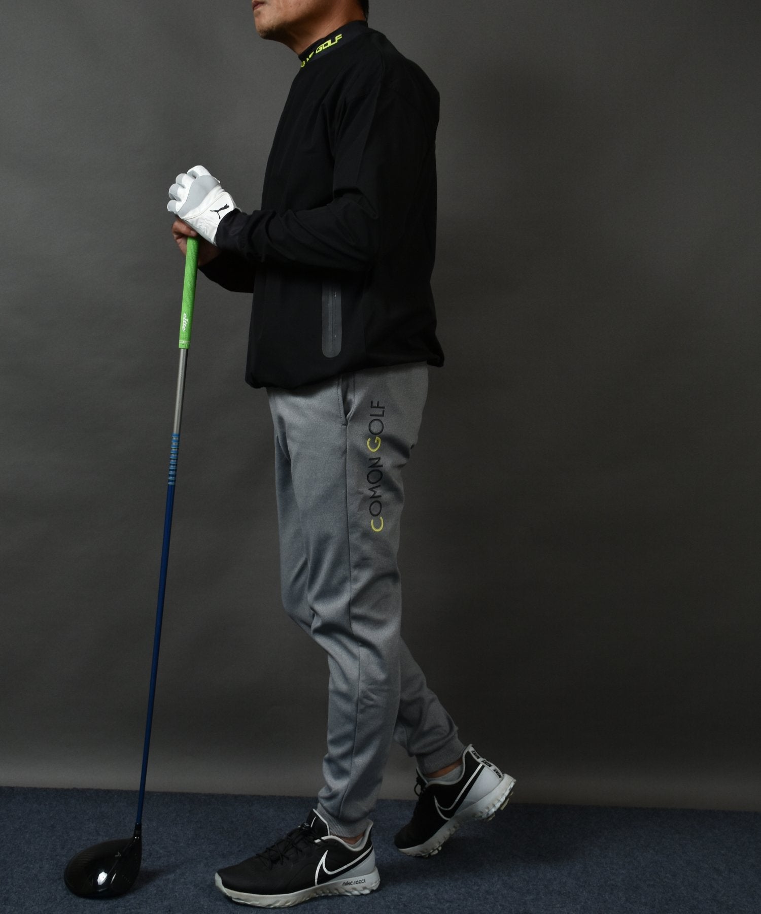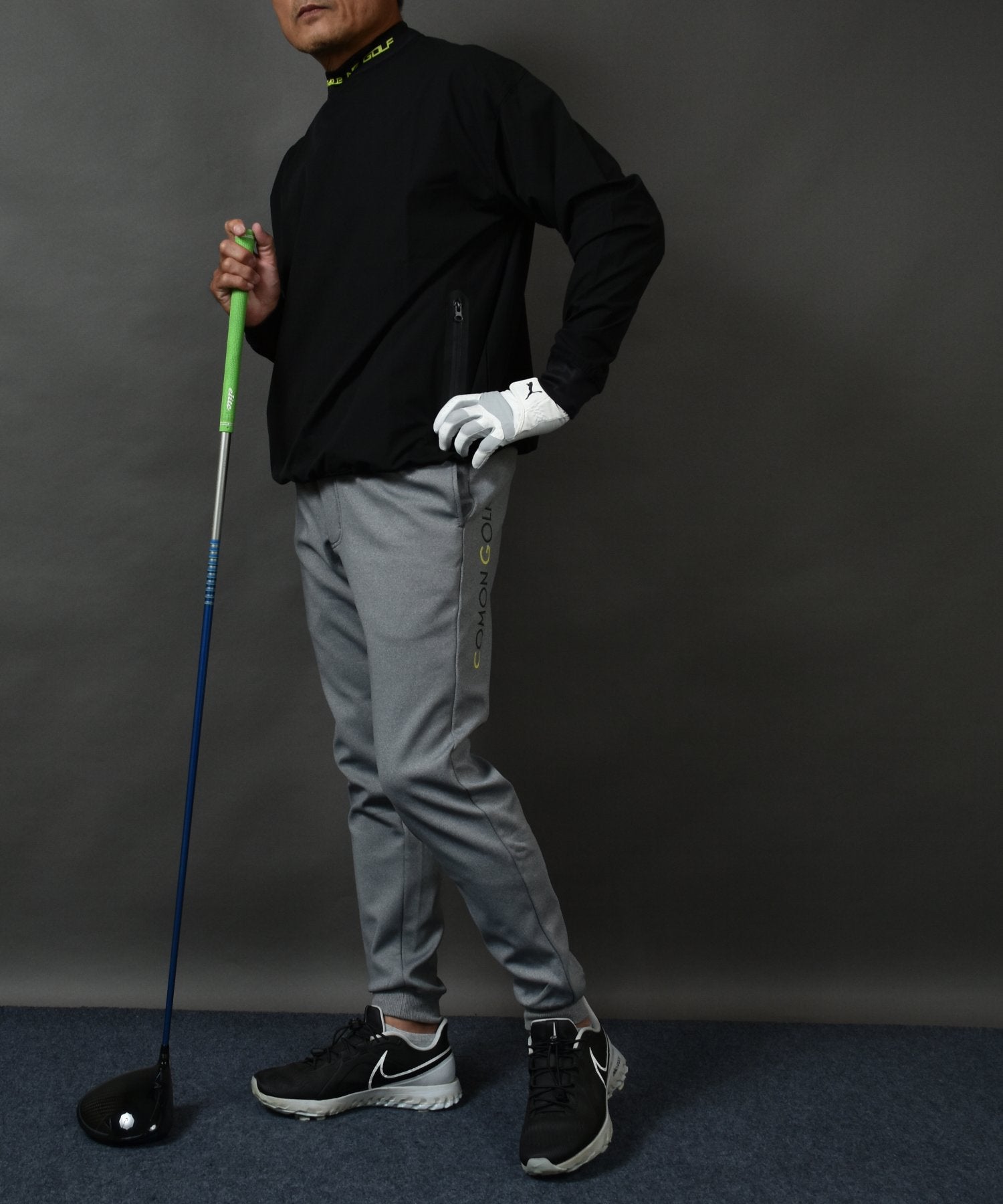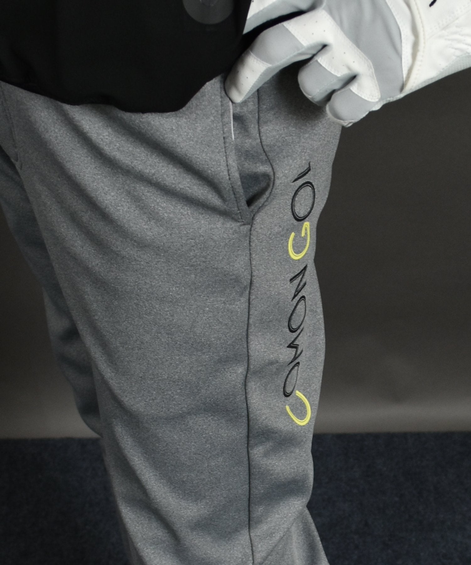 太ももサイドに入ったCOMONGOLFのロゴもキャッチーでおしゃれで、ゴルフだけじゃなく普段使いもできるゴルフパンツです。