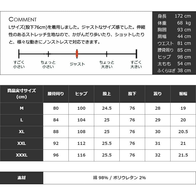 そして何よりぐ〜んと伸びる伸縮性のあるストレッチ生地なので、かがんだり歩いたり、ショットしたりと、様々な動きにノンストレスで対応できます。実際に穿いていただければ、格好よさと快適さに、次のゴルフの予定が待ち遠しくなるはずです!