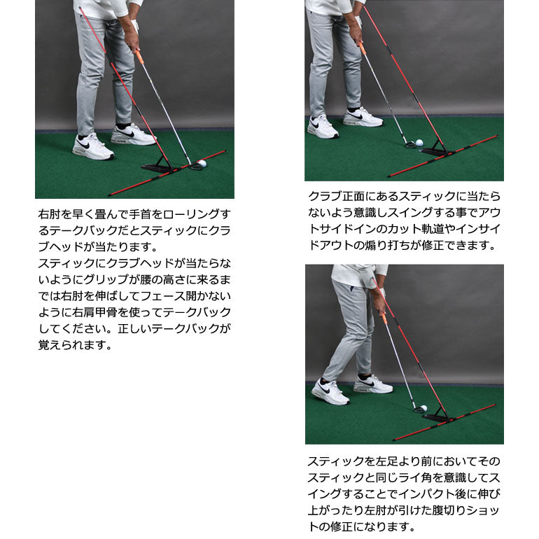 また、カット打ちの場合はインパクトの瞬間にスティックにクラブが当たってしまうので同じく修正に役立ちます。