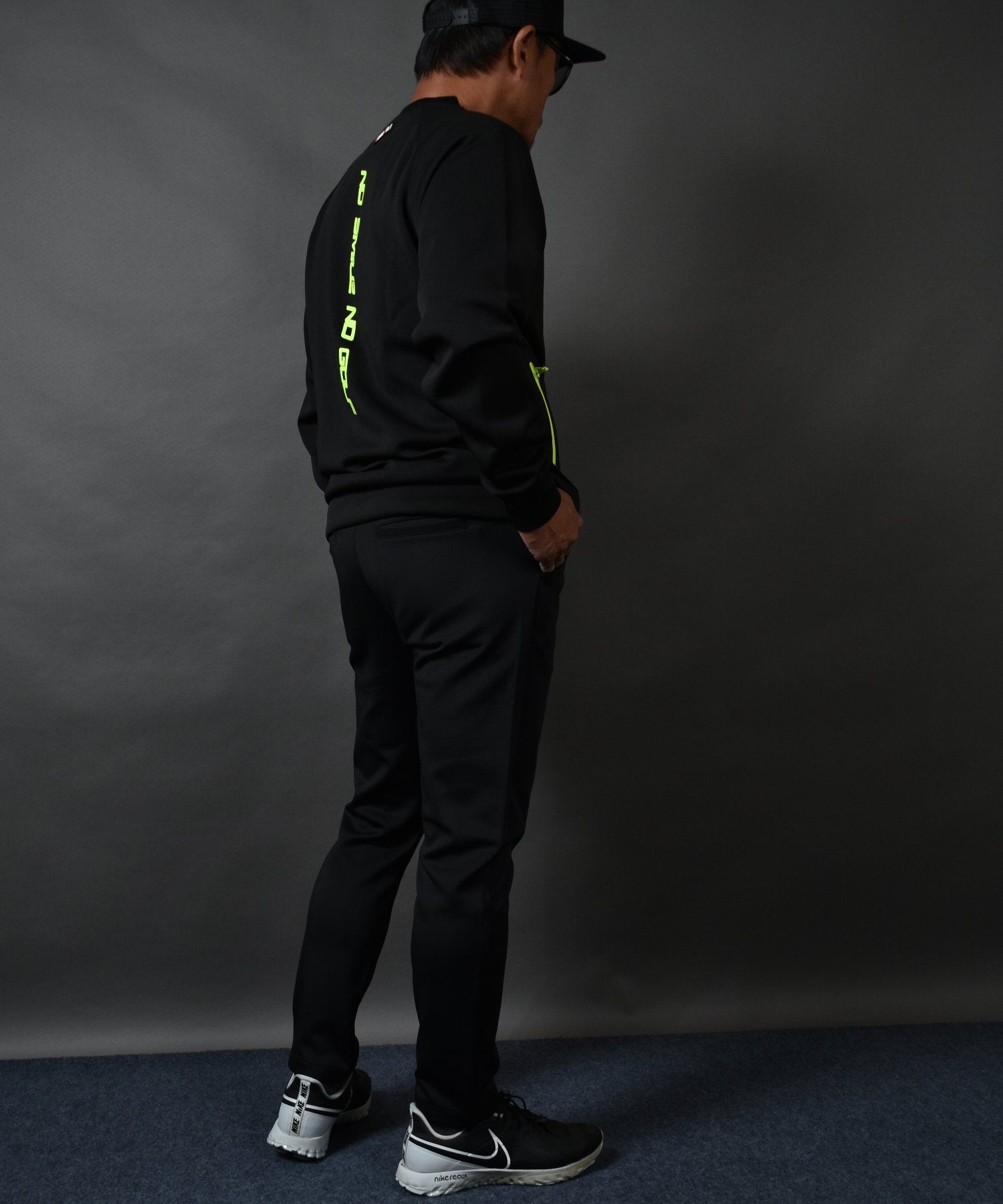 トップスのファスナーとパンツのファスナーの色をネオンカラーで合わせたセットアップになります